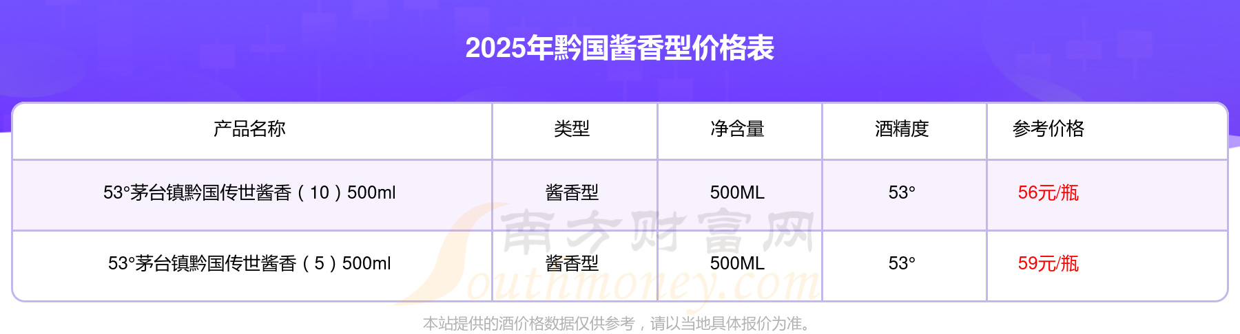 目前,黔國醬香型酒價(jià)格最高的酒為53°茅臺(tái)鎮(zhèn)黔國傳世醬香(5)500ml,參考價(jià)59元/瓶,而黔國醬香型酒價(jià)格最低的是53°茅臺(tái)鎮(zhèn)黔國傳世醬香(10)500ml,參考價(jià)56元/瓶,價(jià)格高低差為3元/瓶。
