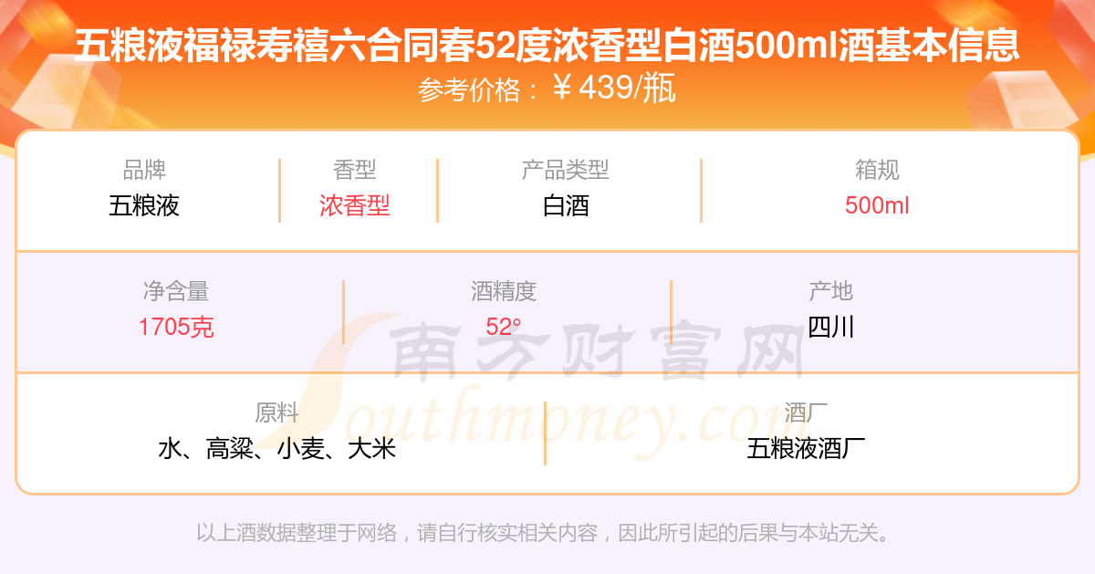 五糧液福祿壽禧六合同春52度濃香型白酒500ml基本信息
