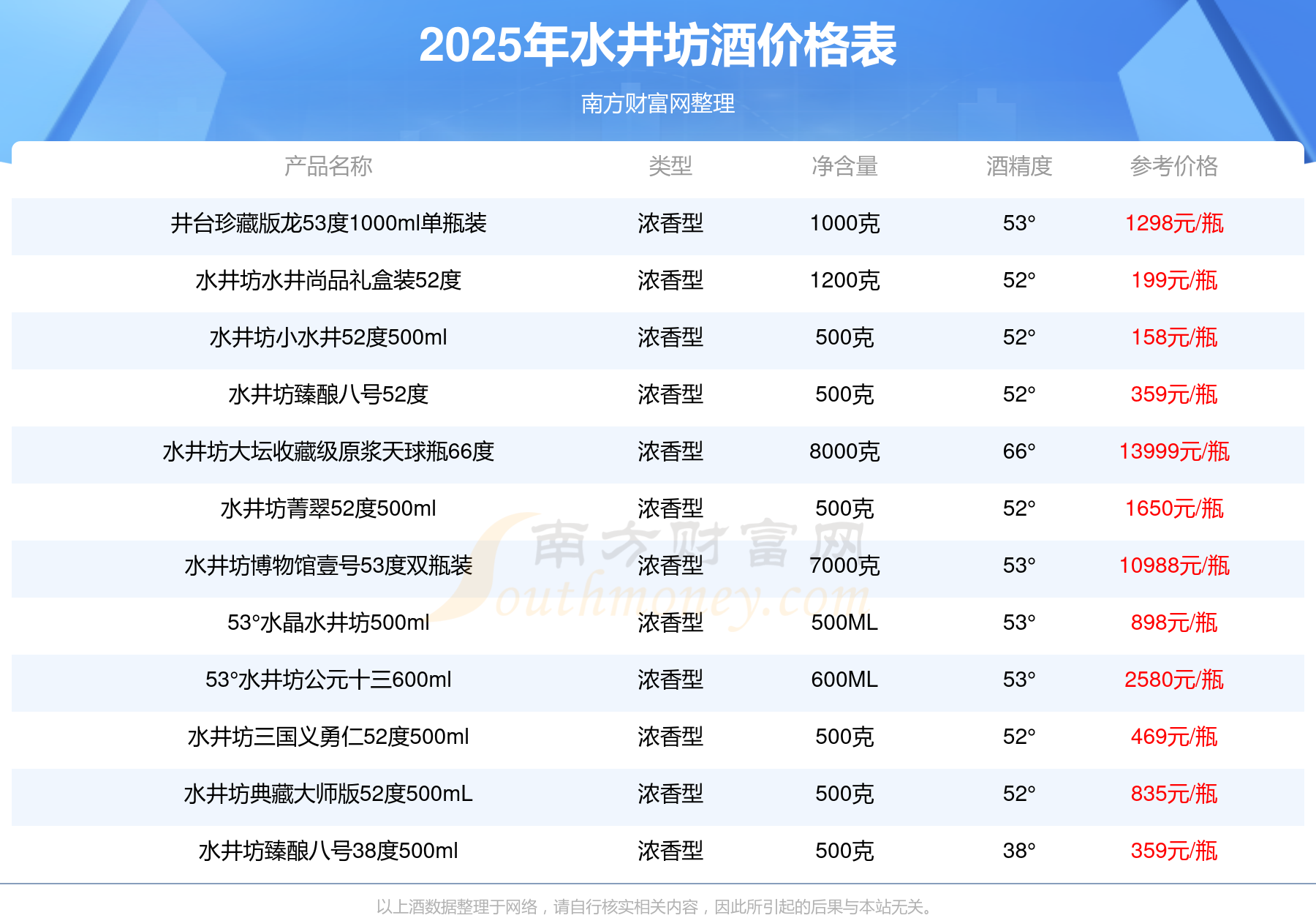 2025年水井坊價(jià)格最高的酒是水井坊大壇收藏級(jí)原漿天球瓶66度,參考價(jià)13999元/瓶,最低的是水井坊小水井52度500ml,參考價(jià)158元/瓶,價(jià)格高低差為13841元/瓶。