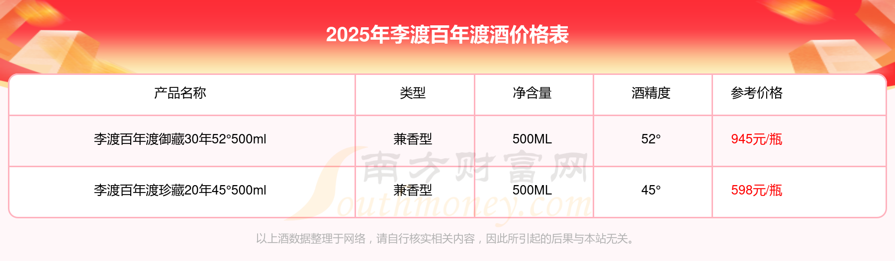 李渡百年渡御藏30年52°500ml參考價945元/瓶、李渡百年渡珍藏20年45°500ml參考價598元/瓶。