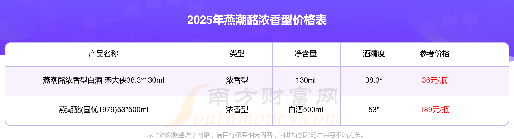 2025年,燕潮酩(國(guó)優(yōu)1979)53°500ml、燕潮酩濃香型白酒 燕大俠38.3°130ml等燕潮酩濃香型酒價(jià)格如下: