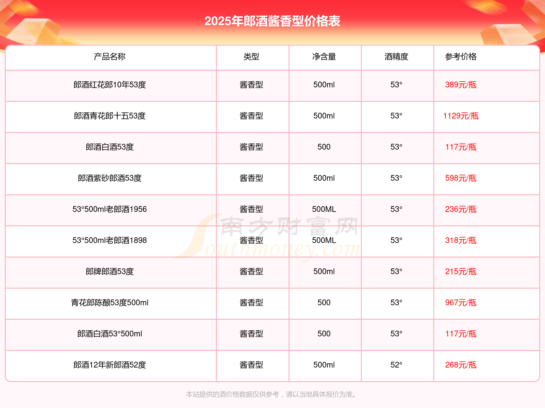 郎酒青花郎十五53度參考價(jià)1129元/瓶、青花郎陳釀53度500ml參考價(jià)967元/瓶、郎酒紫砂郎酒53度參考價(jià)598元/瓶、郎酒紅花郎10年53度參考價(jià)389元/瓶。