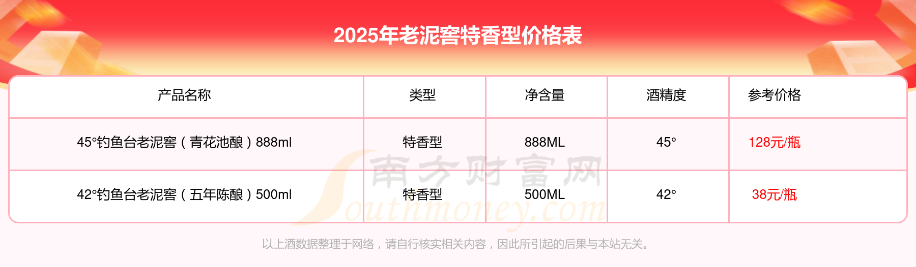 2025年老泥窖特香型酒45°釣魚臺老泥窖(青花池釀)888ml、42°釣魚臺老泥窖(五年陳釀)500ml等最新價格如下:45°釣魚臺老泥窖(青花池釀)888ml參考價128元/瓶、42°釣魚臺老泥窖(五年陳釀)500ml參考價38元/瓶。