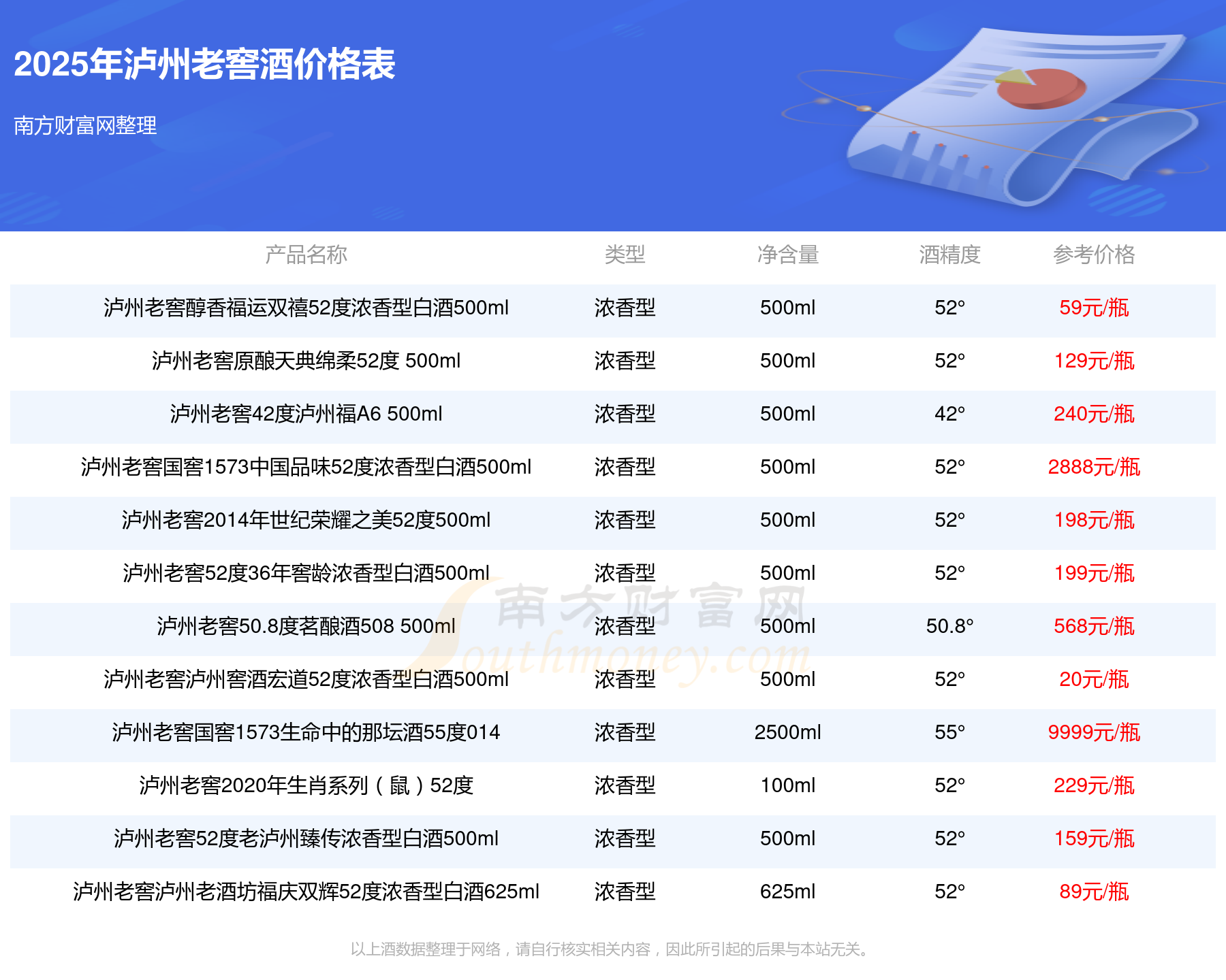 瀘州老窖酒最新價(jià)格2025:瀘州老窖國窖1573春釀鼠兆豐年E 55度參考價(jià)17999元/瓶、瀘州老窖國窖1573生命中的那壇酒55度014參考價(jià)9999元/瓶、瀘州老窖國窖1573春釀鼠兆豐年A 55度參考價(jià)5088元/瓶、瀘州老窖國窖1573生命中的那壇酒55度013濃香型白酒1000ml參考價(jià)4988元/瓶、瀘州老窖國窖1573生命中的那壇酒55度009 1000ml參考價(jià)4288元/瓶、瀘州老窖國窖1573中國品味52度濃香型白酒500ml參考價(jià)2888元/瓶、瀘州老窖國窖1573許燎源概念作品58度濃香型白酒1000ml參考價(jià)2680元/瓶。