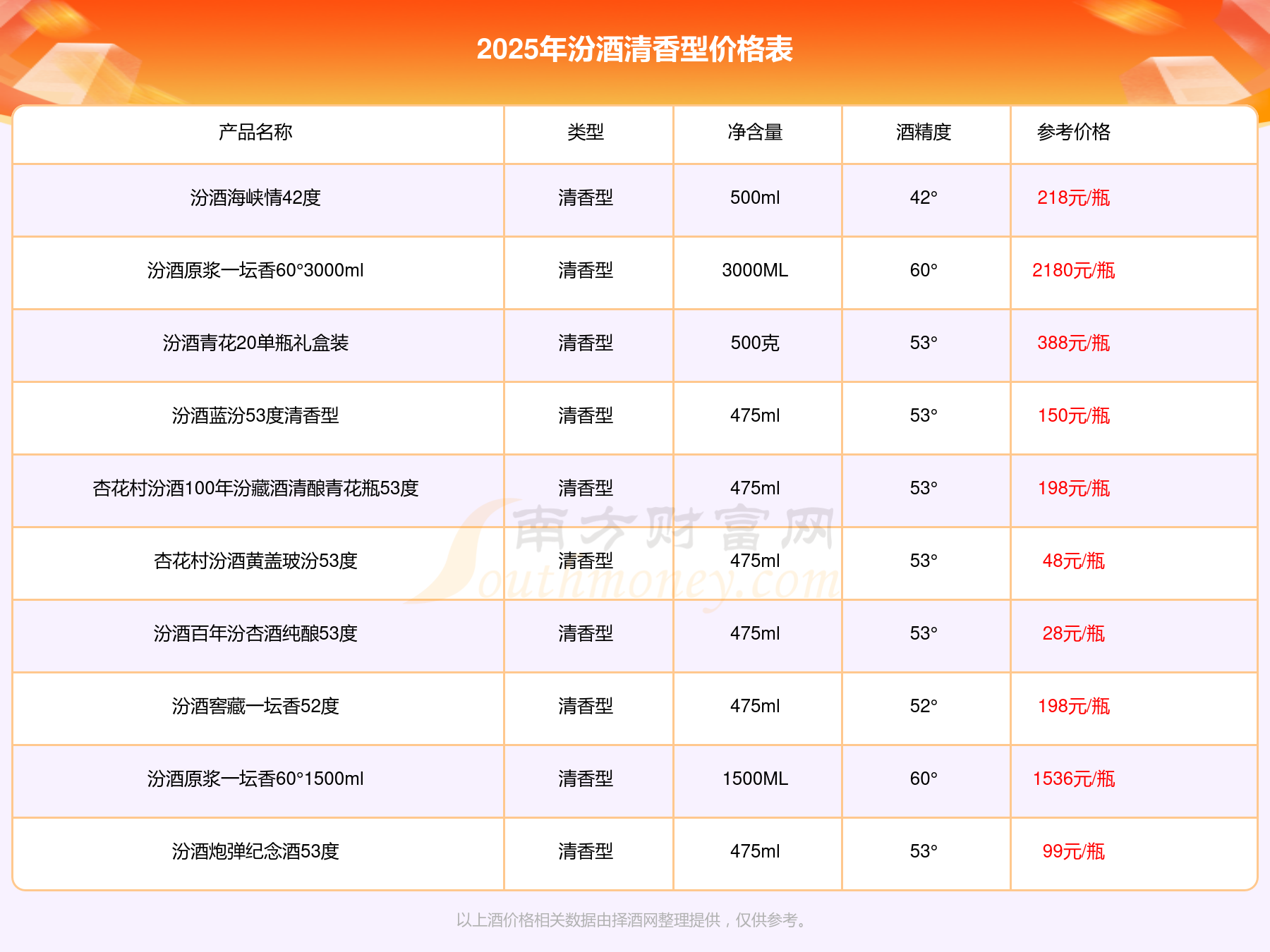 2025汾酒清香型酒最新價(jià)格:汾酒原漿一壇香60°3000ml參考價(jià)2180元/瓶、汾酒原漿一壇香60°1500ml參考價(jià)1536元/瓶、42度汾酒青花25參考價(jià)598元/瓶、汾酒收藏系列盤古汾酒55度參考價(jià)400元/瓶、汾酒關(guān)照原漿60度參考價(jià)399元/瓶、汾酒青花20單瓶禮盒裝參考價(jià)388元/瓶、汾酒海峽情42度參考價(jià)218元/瓶。