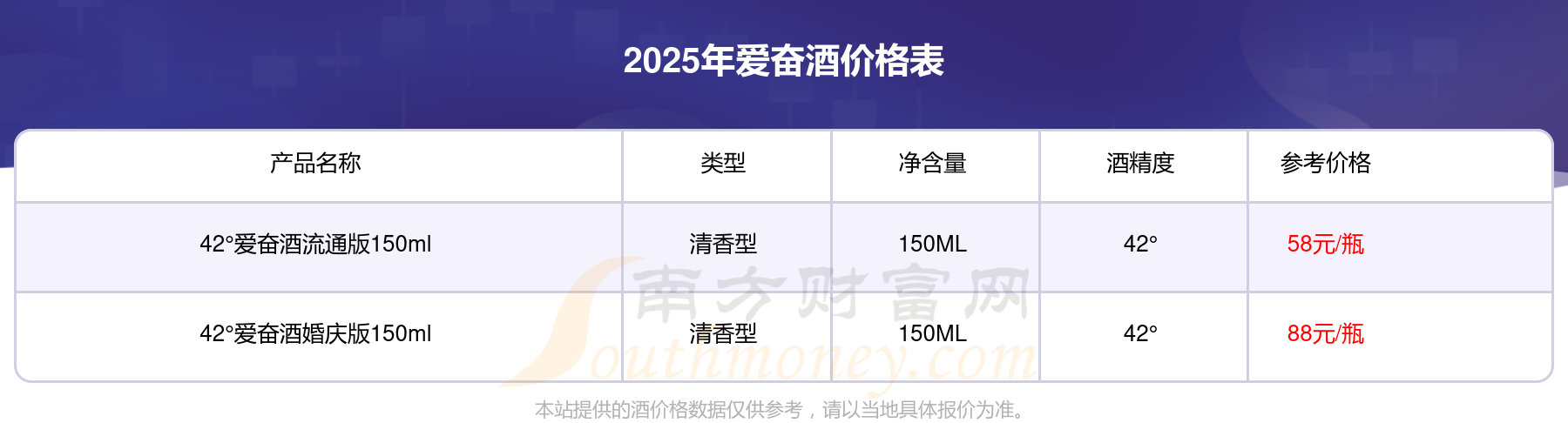 2025年,42°愛奮酒婚慶版150ml、42°愛奮酒流通版150ml等愛奮酒價(jià)格如下: