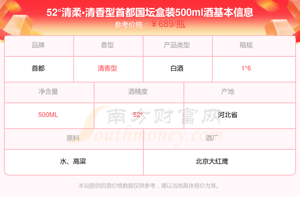 52°清柔?清香型首都國壇盒裝500ml基本信息