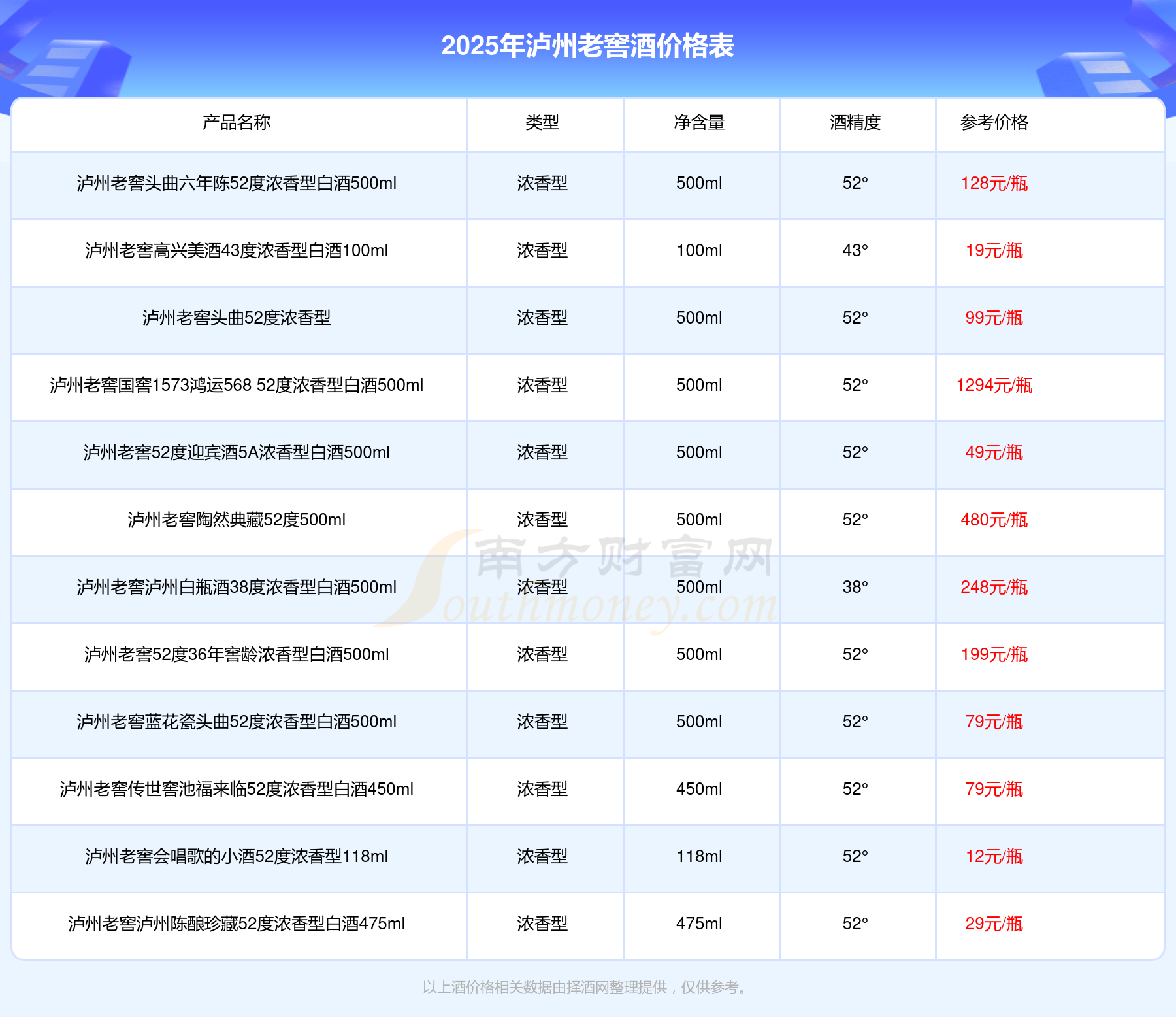 瀘州老窖酒最新價格2025:瀘州老窖國窖1573春釀鼠兆豐年E 55度參考價17999元/瓶、瀘州老窖國窖1573生命中的那壇酒55度014參考價9999元/瓶、瀘州老窖國窖1573春釀鼠兆豐年A 55度參考價5088元/瓶。