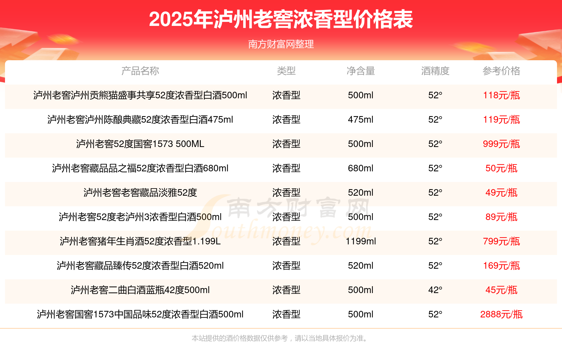 瀘州老窖濃香型酒最新價格2025:瀘州老窖國窖1573春釀鼠兆豐年E 55度參考價17999元/瓶、瀘州老窖國窖1573生命中的那壇酒55度014參考價9999元/瓶、瀘州老窖國窖1573春釀鼠兆豐年A 55度參考價5088元/瓶、瀘州老窖國窖1573生命中的那壇酒55度013濃香型白酒1000ml參考價4988元/瓶、瀘州老窖國窖1573生命中的那壇酒55度009 1000ml參考價4288元/瓶。
