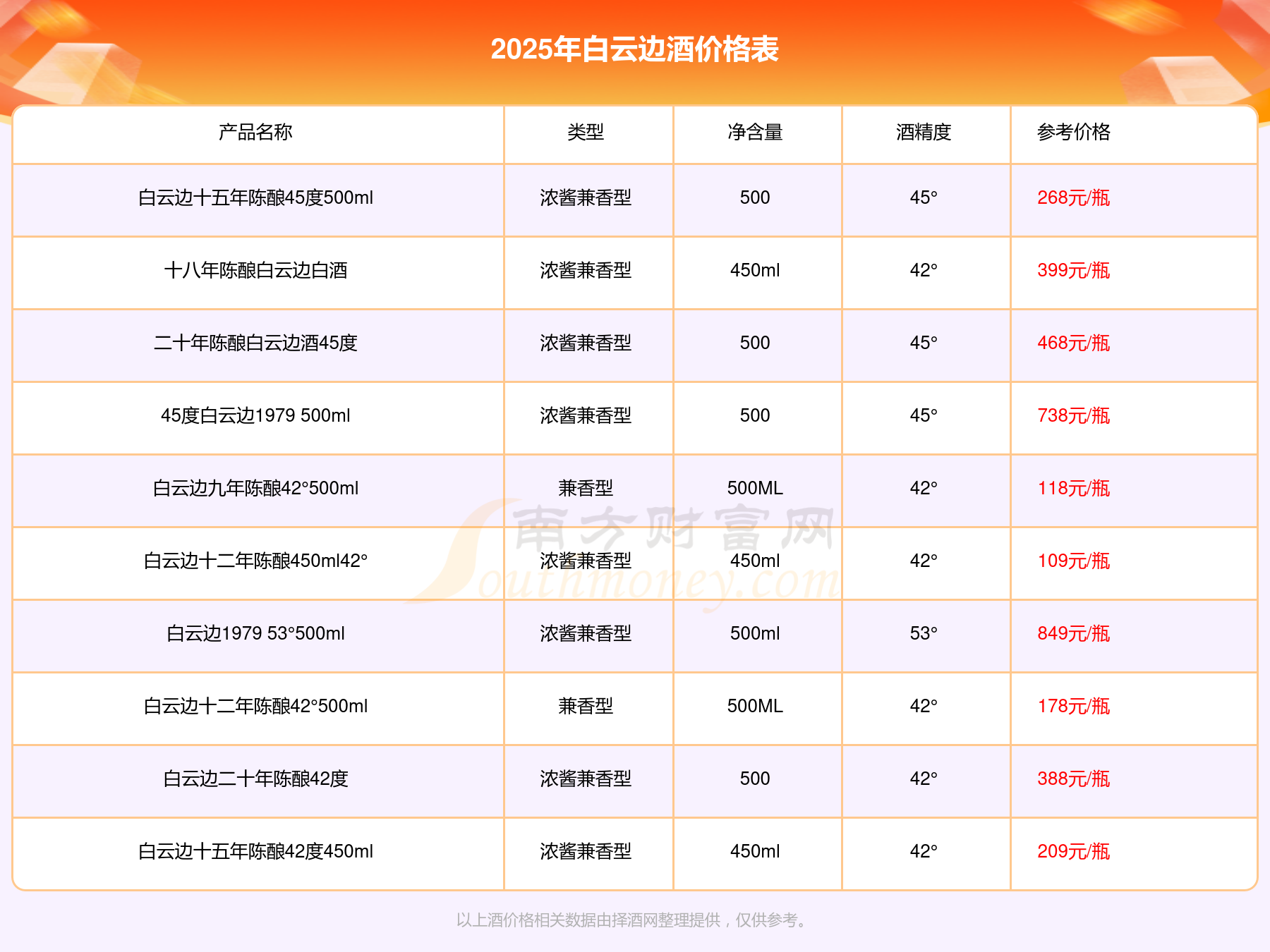 白云邊酒最新價格2025:白云邊1979 53°500ml參考價849元/瓶、45度白云邊1979 500ml參考價738元/瓶、二十年陳釀白云邊酒45度參考價468元/瓶。