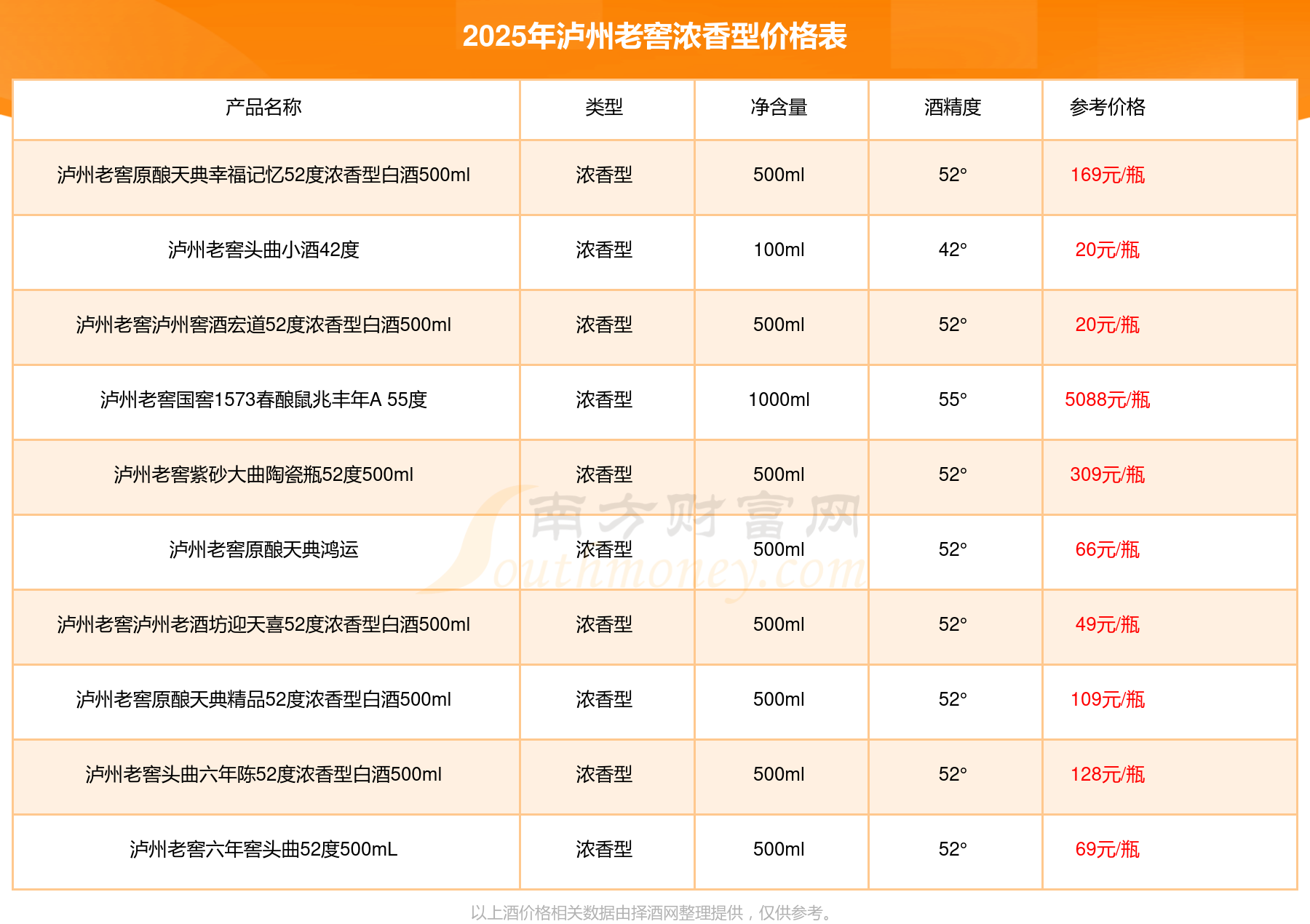 目前,瀘州老窖濃香型酒價(jià)格最高的酒為瀘州老窖國(guó)窖1573春釀鼠兆豐年E 55度,參考價(jià)17999元/瓶,而瀘州老窖濃香型酒價(jià)格最低的是瀘州老窖45度五洲醉8窖經(jīng)典小酒版濃香型100ml,參考價(jià)10元/瓶,價(jià)格高低差為17989元/瓶。