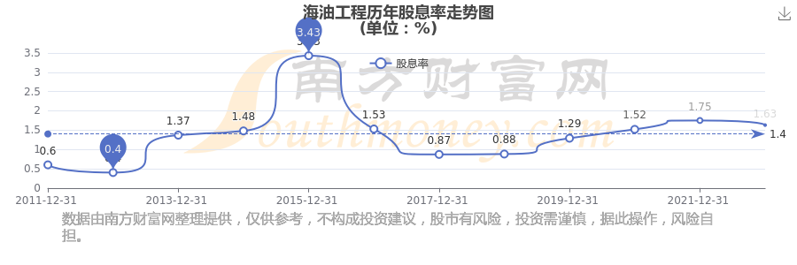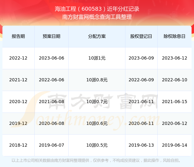 海油工程最新一次公布的分紅方案為10派1元。本次權(quán)益分派股權(quán)登記日為2023年6月9日,除權(quán)除息日為2023年6月12日,派息日為2023年6月12日。