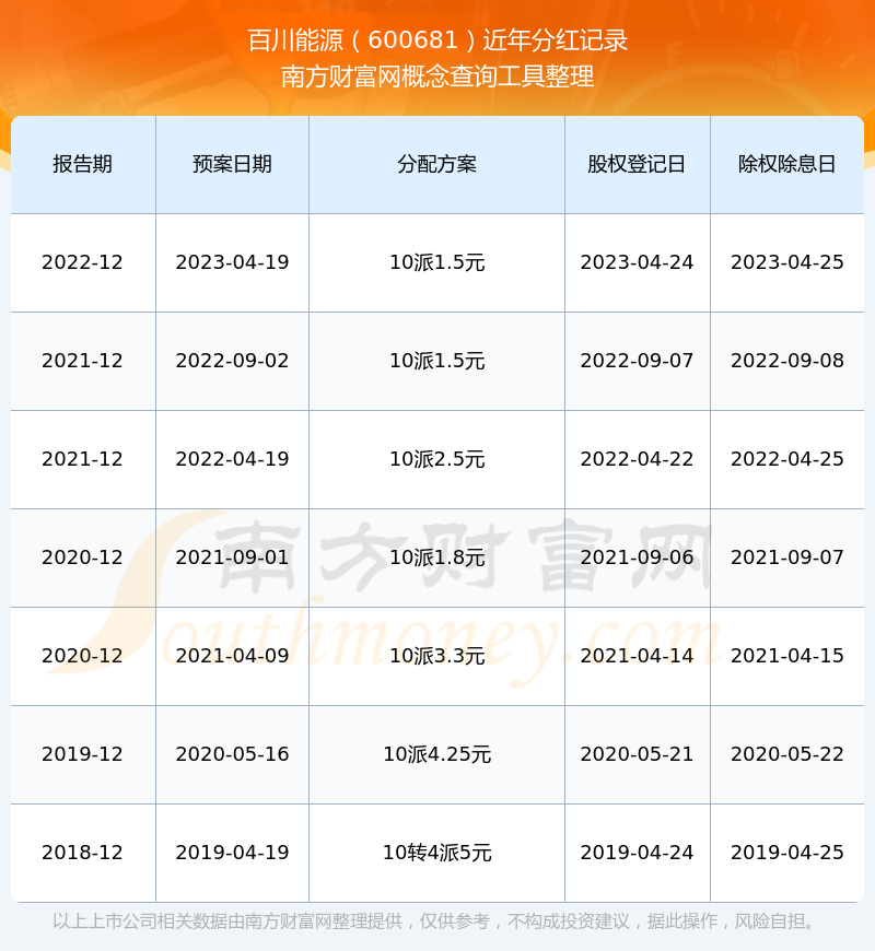 百川能源最新一次公布的分紅方案為10派1.5元。本次權(quán)益分派股權(quán)登記日為2023年4月24日,除權(quán)除息日為2023年4月25日,派息日為2023年4月25日。