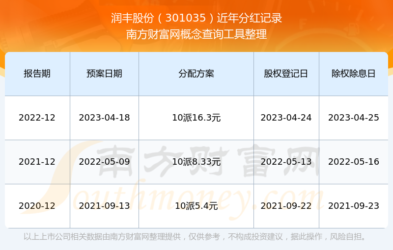 潤豐股份最新一次公布的分紅方案為10派16.3元。本次權(quán)益分派股權(quán)登記日為2023年4月24日,除權(quán)除息日為2023年4月25日,派息日為2023年4月25日。