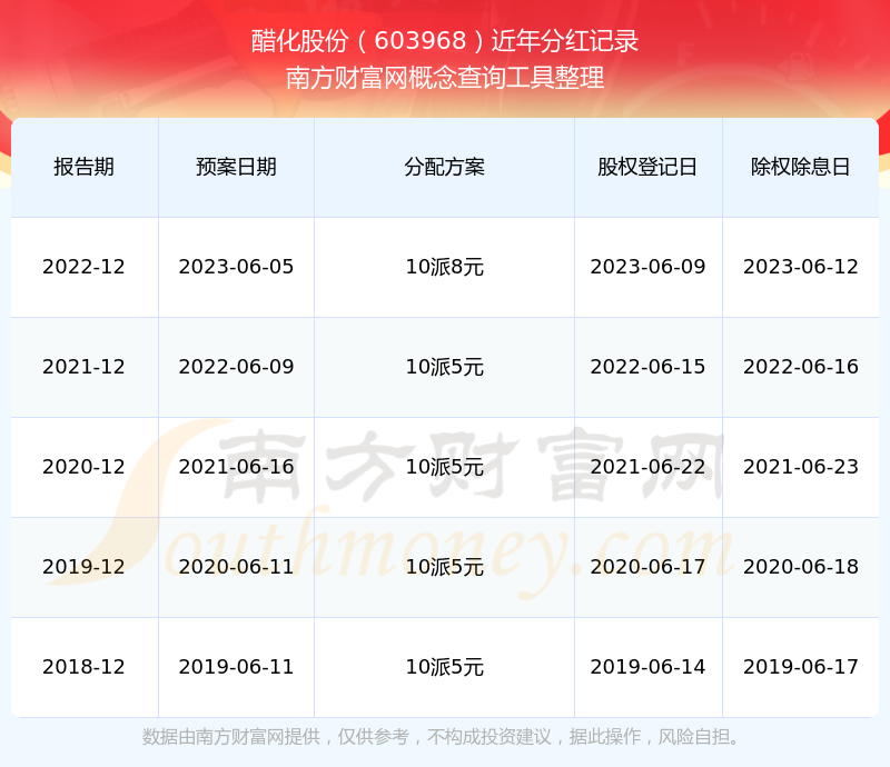 醋化股份最新一次公布的分紅方案為10派8元。本次權(quán)益分派股權(quán)登記日為2023年6月9日,除權(quán)除息日為2023年6月12日,派息日為2023年6月12日。