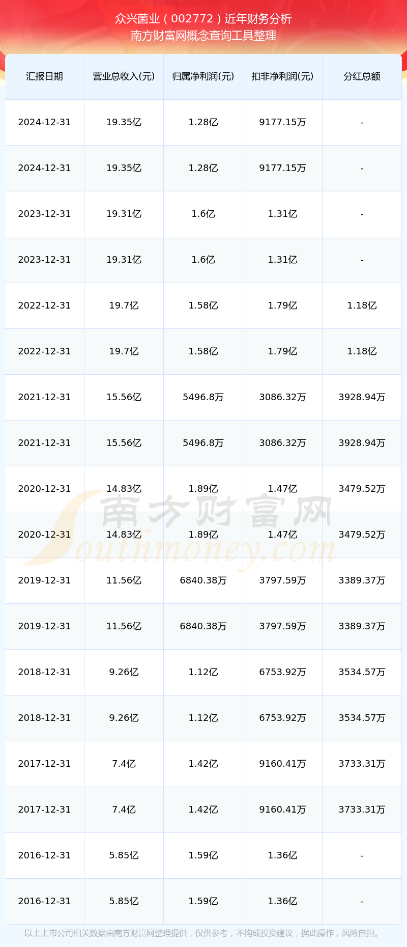 2024年報(bào)顯示,眾興菌業(yè)實(shí)現(xiàn)營收19.35億,同比增長0.21%;凈利潤1.28億,同比增長-19.77%;毛利率20.84%。