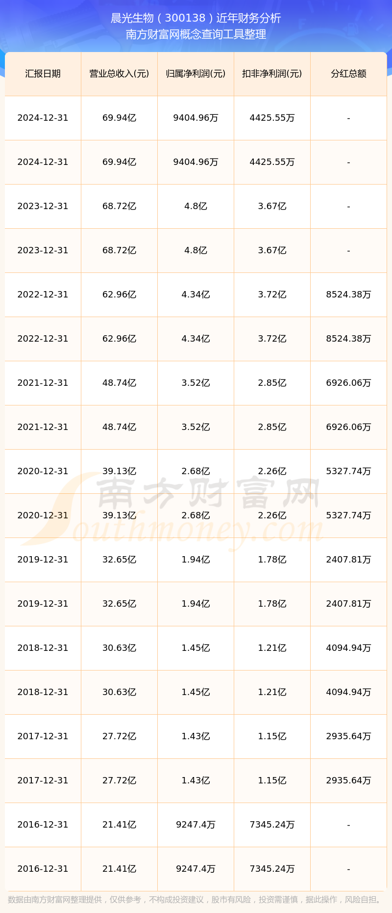 2024年晨光生物總營收69.94億,同比增長1.79%;凈利潤9404.96萬,同比增長-80.4%;銷售毛利率7.96%。