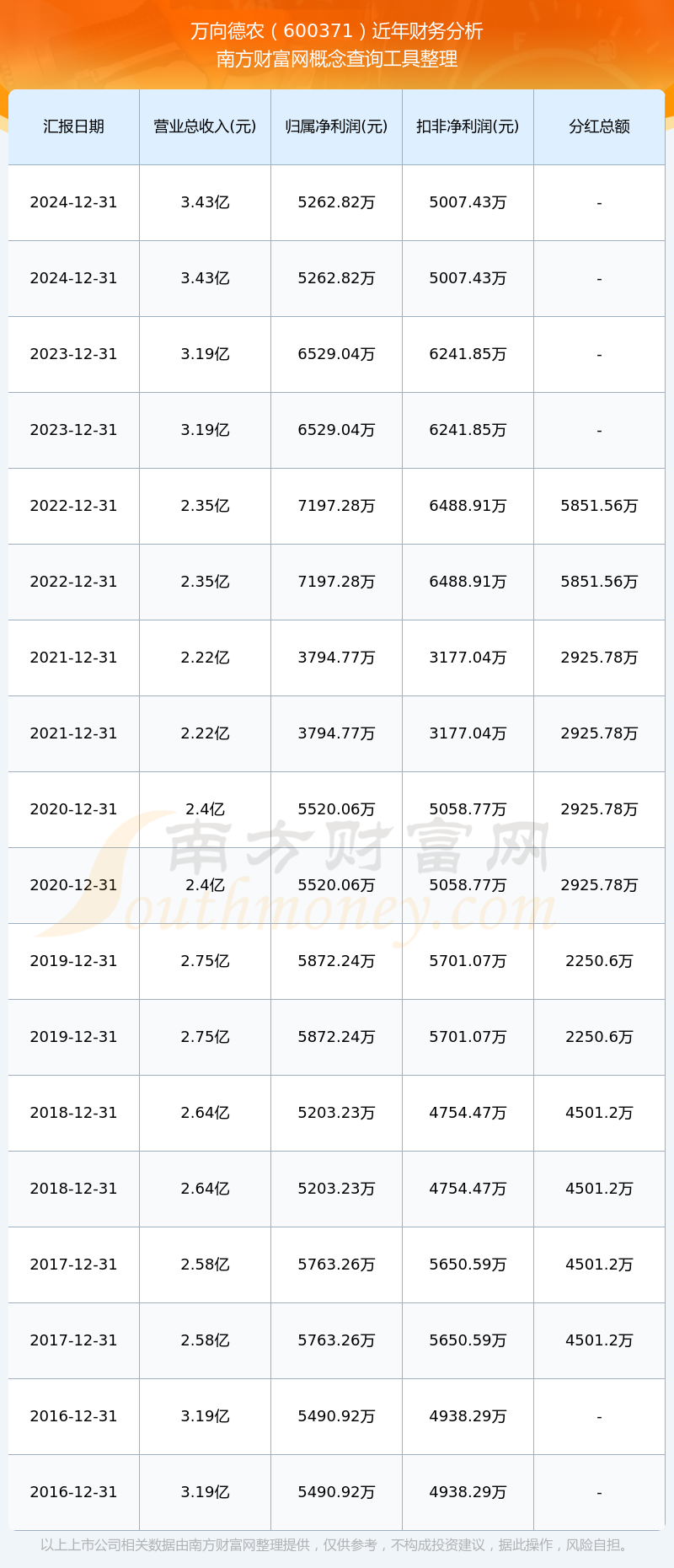 萬向德農(nóng)歷年分紅派息情況如下表所示: