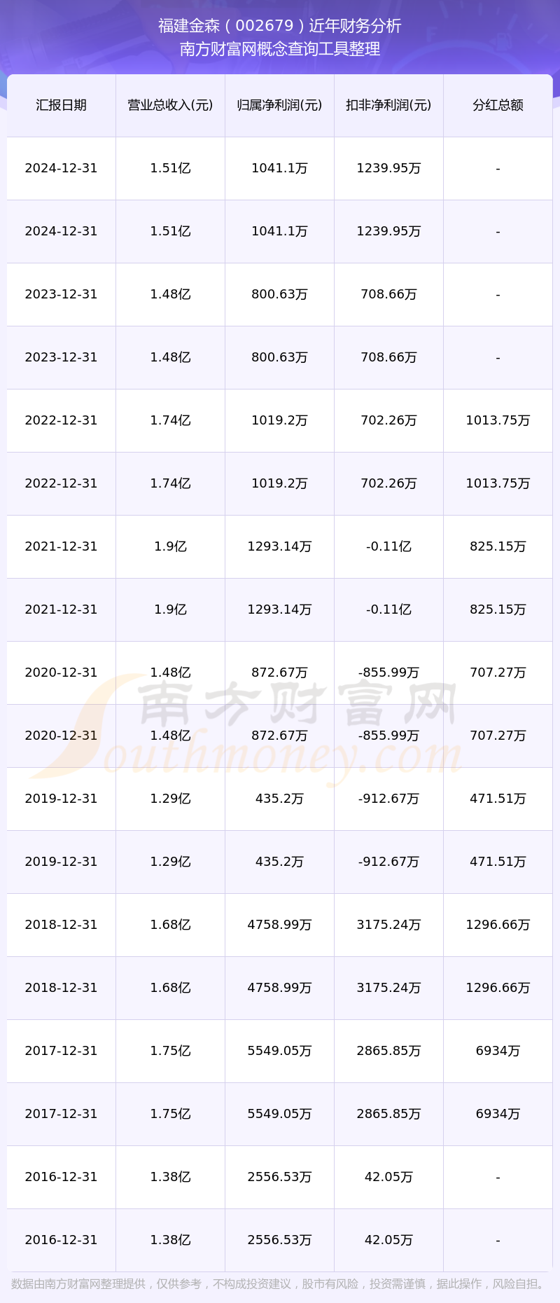 近年福建金森分紅派息情況如下表所示: