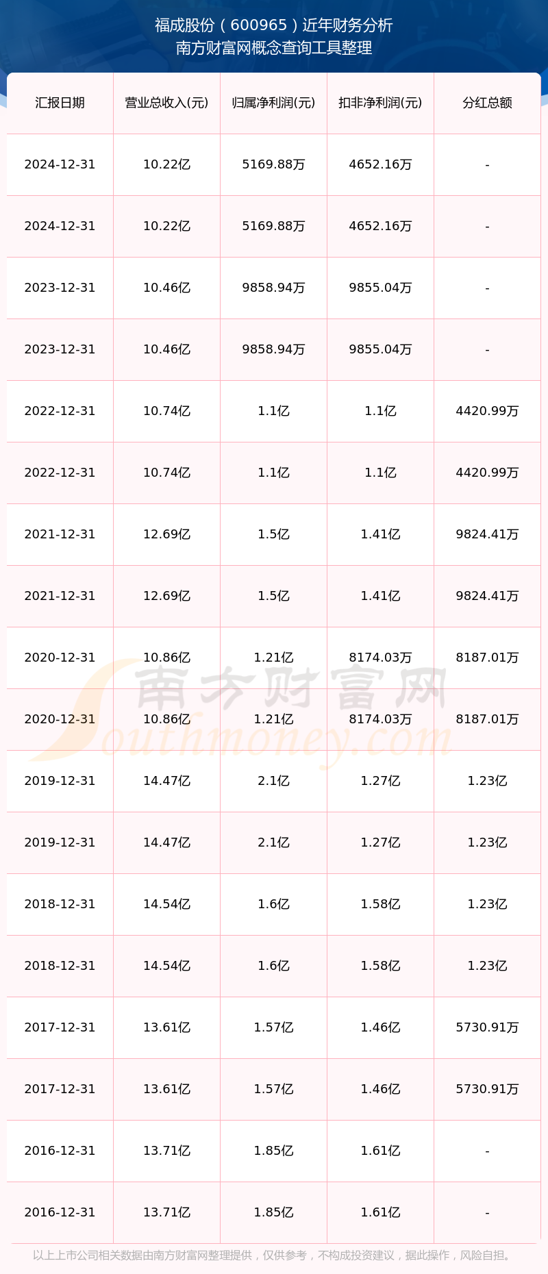 2024年福成股份總營收10.22億,同比增長-2.36%;凈利潤5169.88萬,同比增長-47.56%;銷售毛利率25.44%。