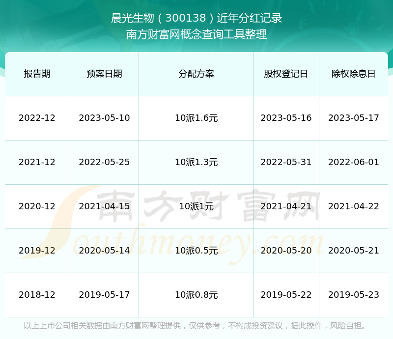 晨光生物最新一次公布的分紅方案為10派1.6元。本次權(quán)益分派股權(quán)登記日為2023年5月16日,除權(quán)除息日為2023年5月17日,派息日為2023年5月17日。