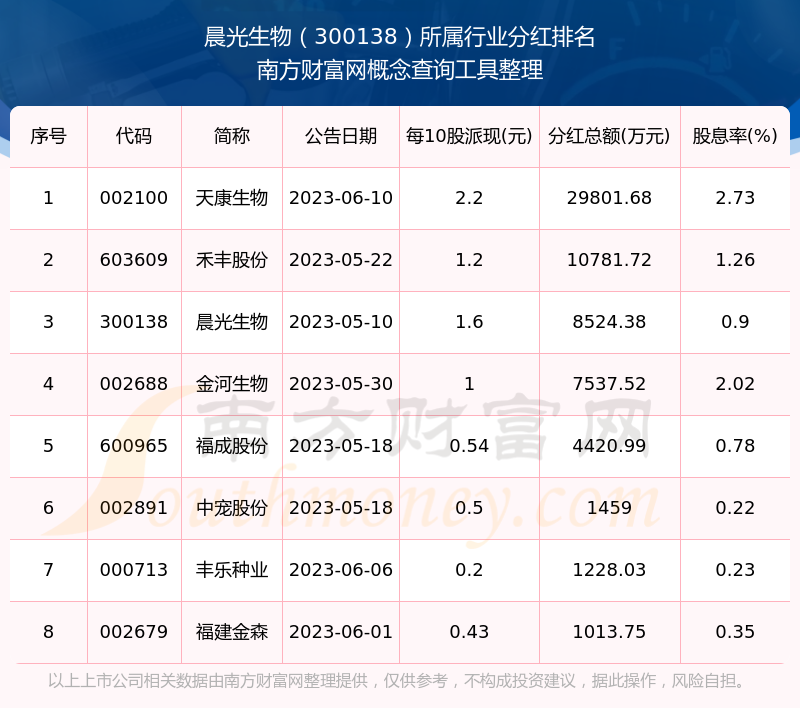 按照南方財(cái)富網(wǎng)趨勢(shì)選股系統(tǒng)統(tǒng)計(jì),晨光生物所屬行業(yè)為農(nóng)業(yè)種植行業(yè),農(nóng)業(yè)種植行業(yè)分紅排名情況如下表: