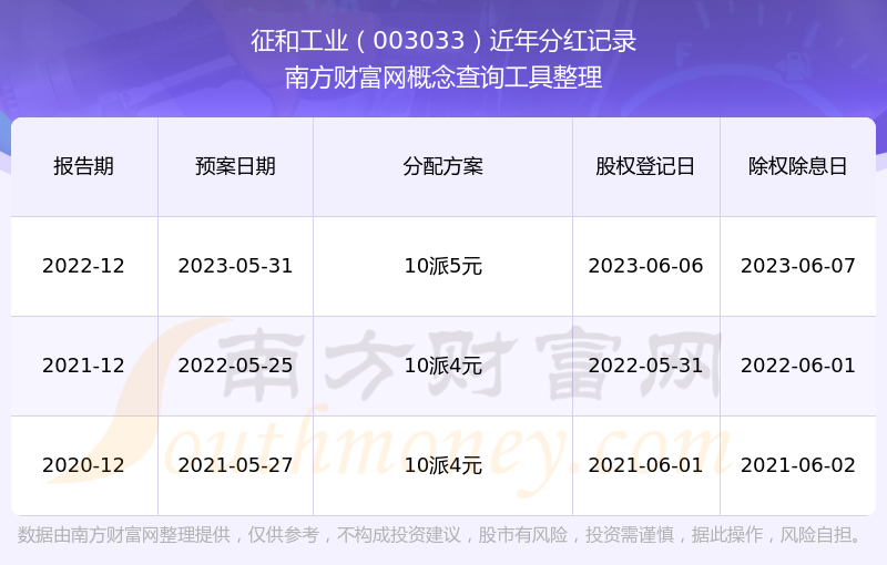 征和工業(yè)最新一次公布的分紅方案為10派5元。本次權(quán)益分派股權(quán)登記日為2023年6月6日,除權(quán)除息日為2023年6月7日,派息日為2023年6月7日。