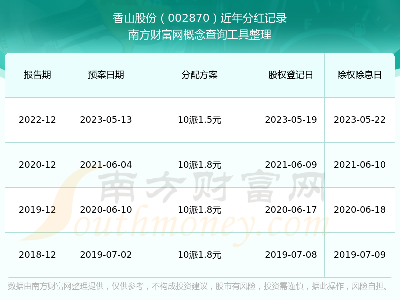 香山股份最新一次公布的分紅方案為10派1.5元。本次權(quán)益分派股權(quán)登記日為2023年5月19日,除權(quán)除息日為2023年5月22日,派息日為2023年5月22日。