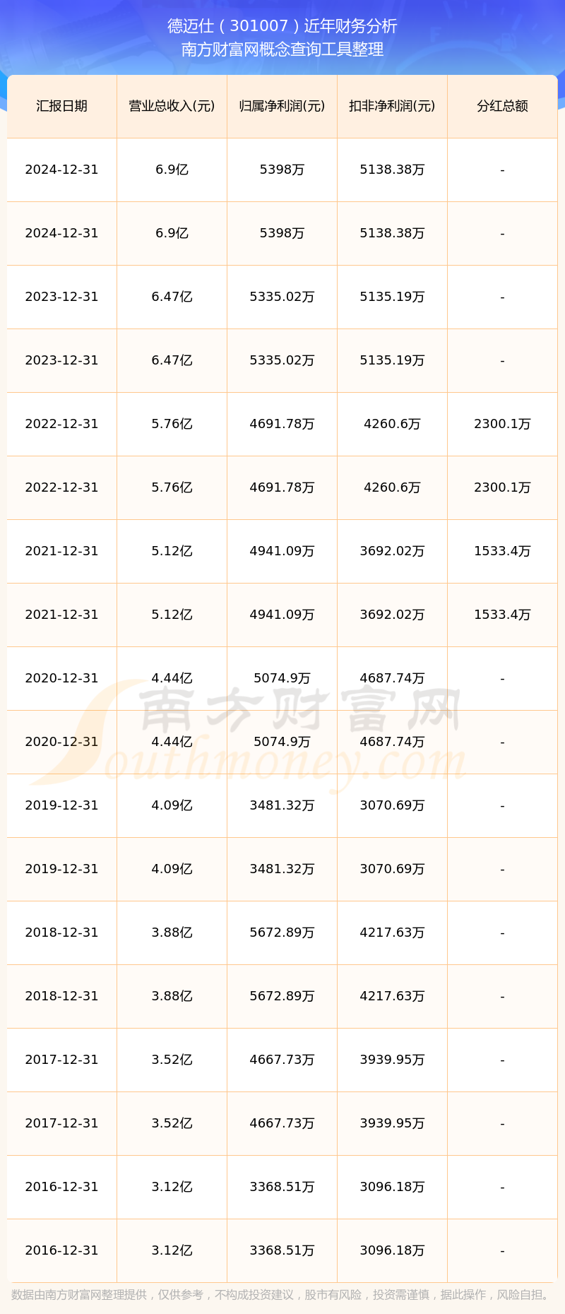 德邁仕歷年分紅派息情況如下表所示: