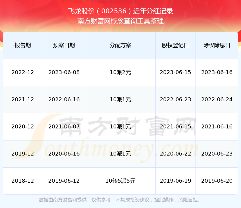 飛龍股份最新一次公布的分紅方案為10派2元。本次權(quán)益分派股權(quán)登記日為2023年6月15日,除權(quán)除息日為2023年6月16日,派息日為2023年6月16日。