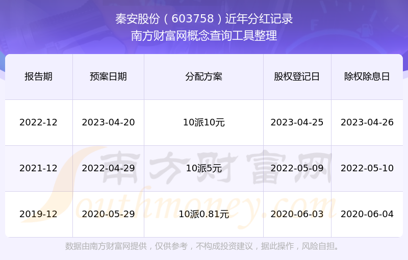 秦安股份最新一次公布的分紅方案:10派10元。