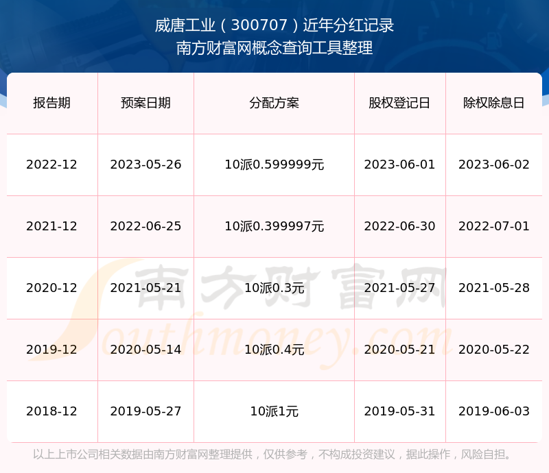 威唐工業(yè)最新一次公布的分紅方案為10派0.599999元。本次權(quán)益分派股權(quán)登記日為2023年6月1日,除權(quán)除息日為2023年6月2日,派息日為2023年6月2日。