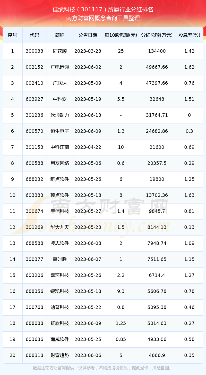 按照南方財富網趨勢選股系統統計,佳緣科技所屬行業(yè)為軟件開發(fā)行業(yè),軟件開發(fā)行業(yè)分紅排名情況如下表: