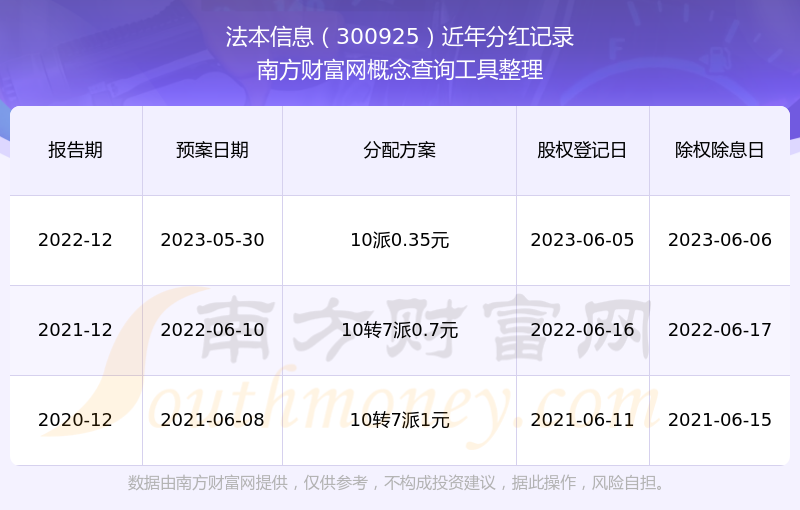 法本信息最新一次公布的分紅方案為10派0.35元。本次權(quán)益分派股權(quán)登記日為2023年6月5日,除權(quán)除息日為2023年6月6日,派息日為2023年6月6日。