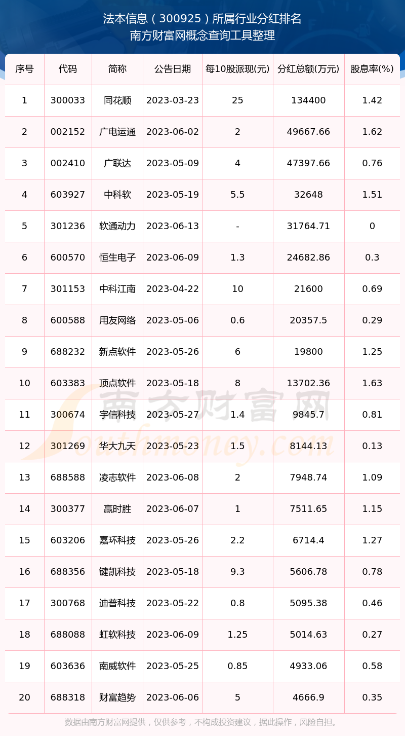 按照南方財富網(wǎng)趨勢選股系統(tǒng)統(tǒng)計,法本信息所屬行業(yè)為軟件開發(fā)行業(yè),軟件開發(fā)行業(yè)分紅排名情況如下表: