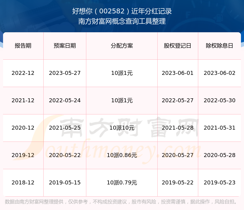 好想你最新一次公布的分紅方案為10派1元。本次權(quán)益分派股權(quán)登記日為2023年6月1日,除權(quán)除息日為2023年6月2日,派息日為2023年6月2日。
