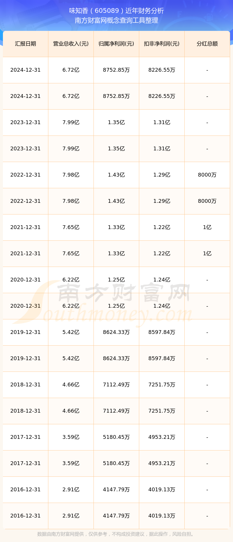 近年味知香分紅派息情況如下表所示: