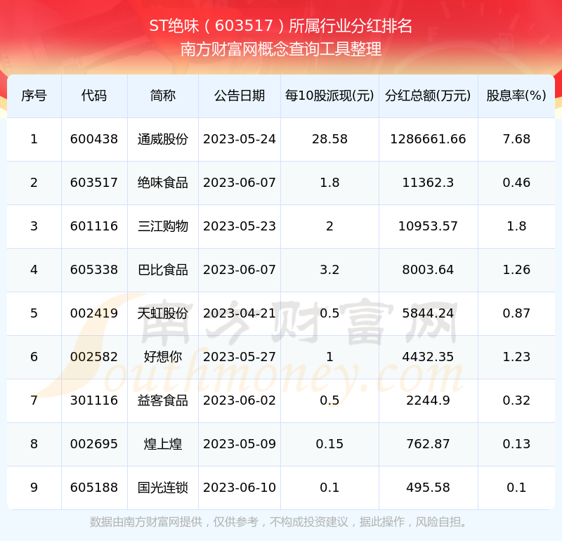 按照南方財(cái)富網(wǎng)趨勢選股系統(tǒng)統(tǒng)計(jì),ST絕味所屬行業(yè)為食品行業(yè),食品行業(yè)分紅排名情況如下表: