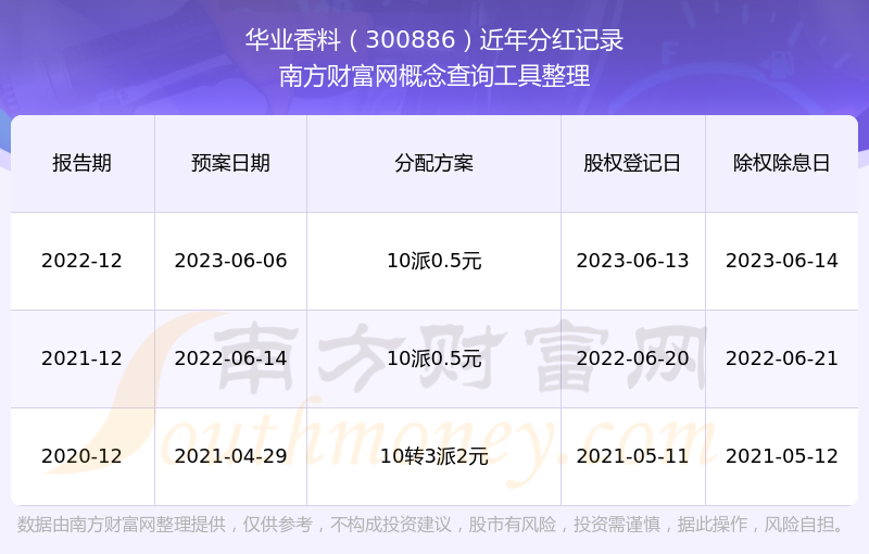 華業(yè)香料最新一次公布的分紅方案為10派0.5元。本次權(quán)益分派股權(quán)登記日為2023年6月13日,除權(quán)除息日為2023年6月14日,派息日為2023年6月14日。