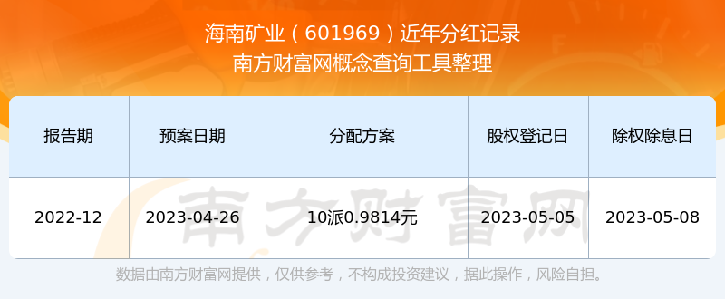 海南礦業(yè)最新一次公布的分紅方案為10派0.9814元。本次權(quán)益分派股權(quán)登記日為2023年5月5日,除權(quán)除息日為2023年5月8日,派息日為2023年5月8日。