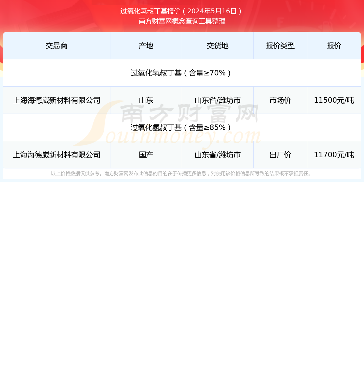 2024年5月16日,上海海德崴新材料有限公司過氧化氫叔丁基(含量≥85%),國產(chǎn),交易地點(diǎn)為山東省/濰坊市,報(bào)價(jià)為11700.00元/噸。