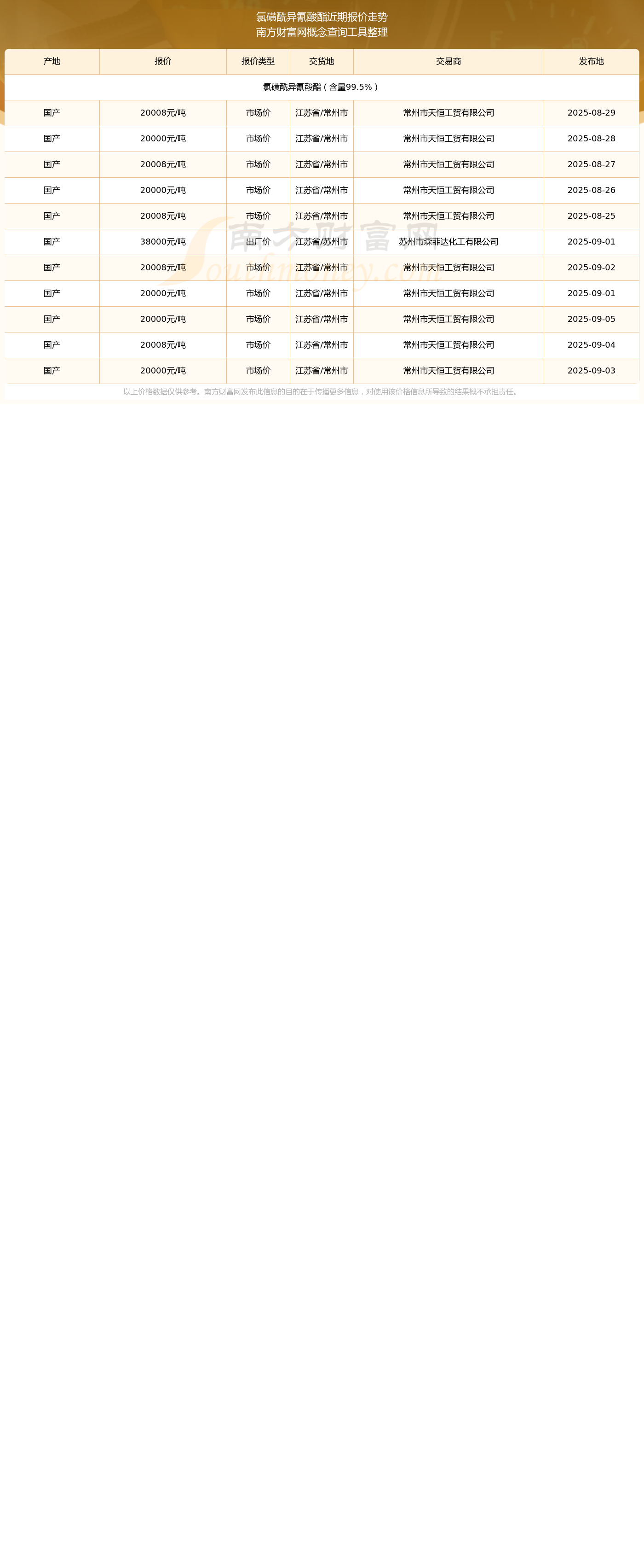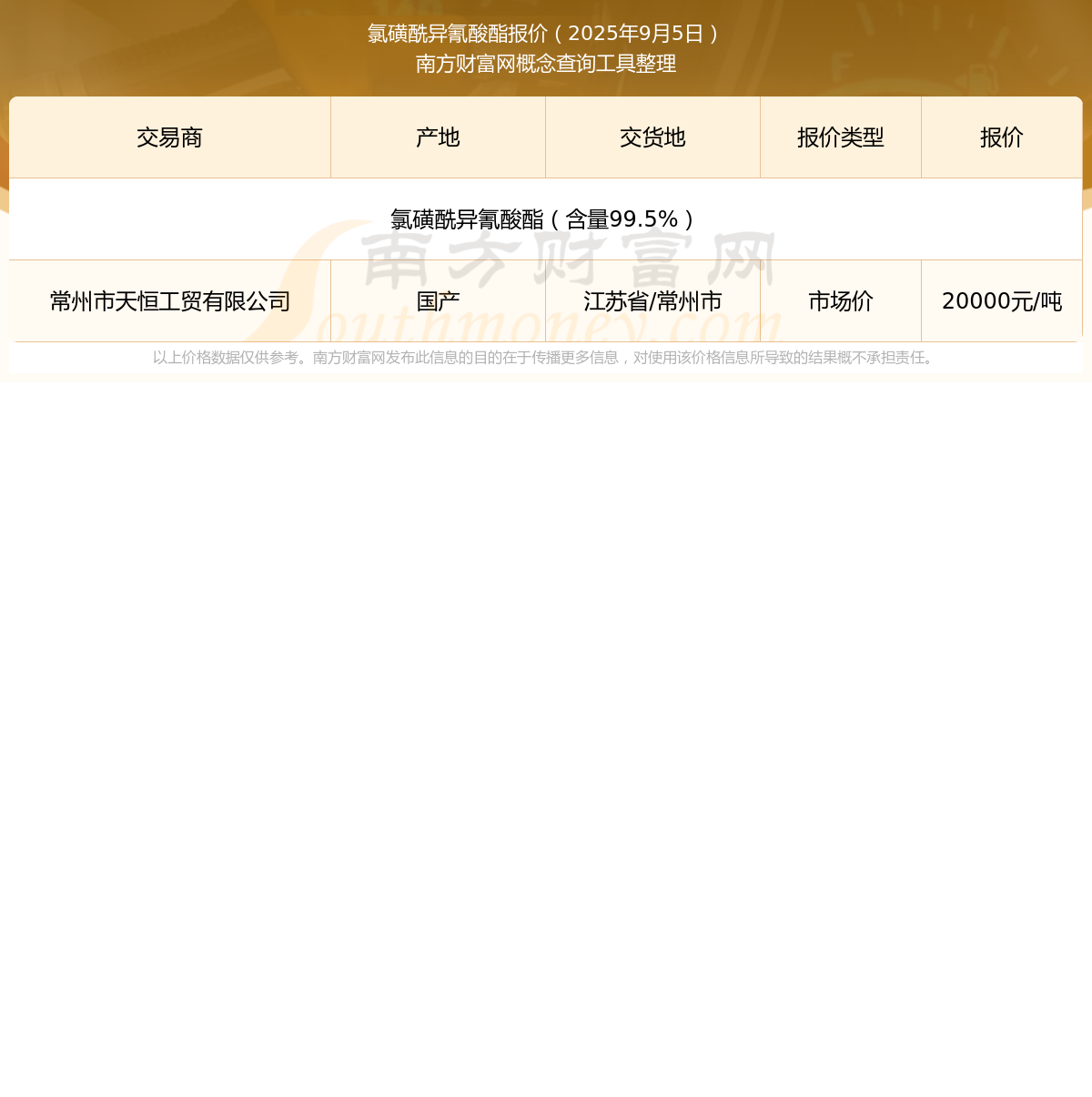 2025年9月5日,常州市天恒工貿(mào)有限公司氯磺酰異氰酸酯(含量99.5%),國產(chǎn),交易地點(diǎn)為江蘇省/常州市,報(bào)價(jià)為20000.00元/噸。
