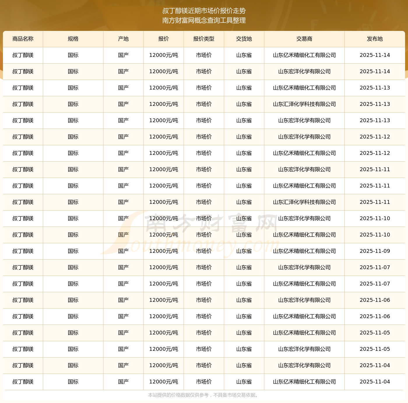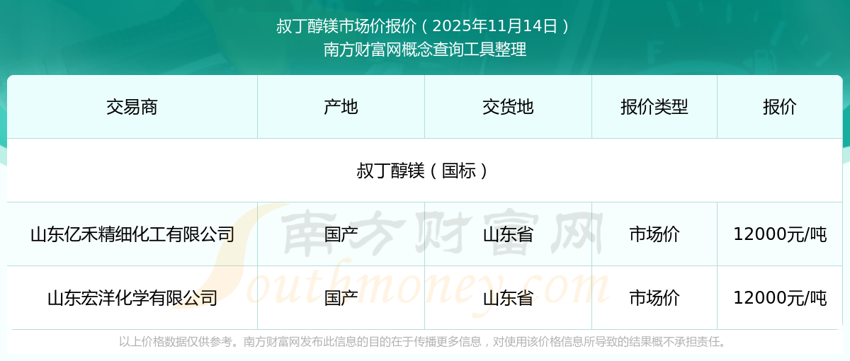2025年11月14日,山東宏洋化學有限公司叔丁醇鎂(國標),國產,交易地點為山東省,市場價報價為12000.00元/噸。