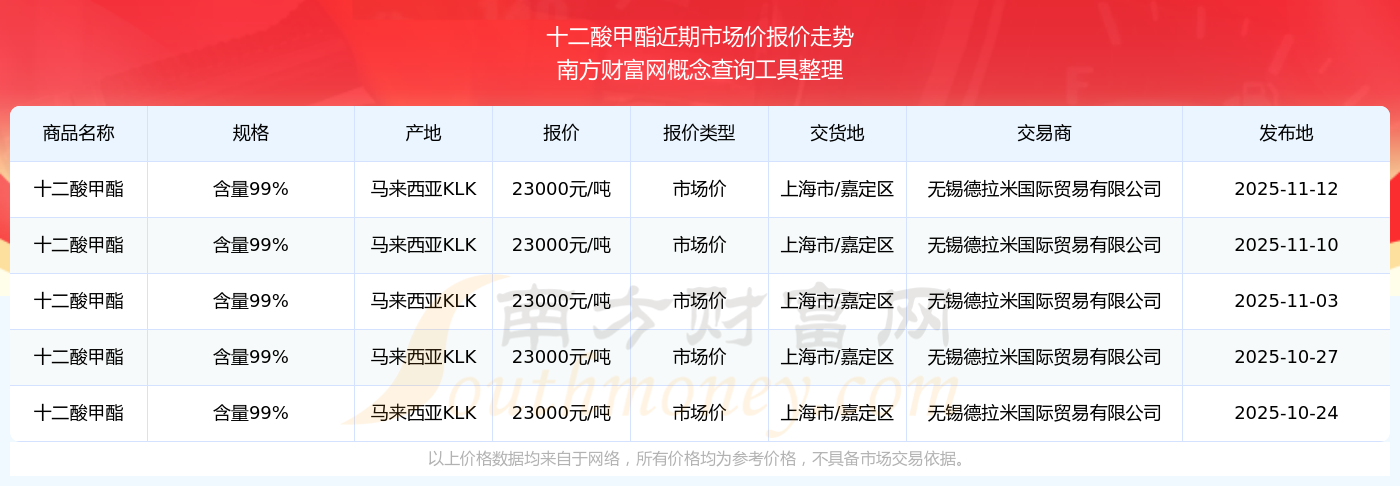 2025年11月12日,十二酸甲酯(含量99%)市場(chǎng)價(jià)價(jià)格為23000.00元/噸,報(bào)價(jià)人:無錫德拉米國(guó)際貿(mào)易有限公司,交易地點(diǎn)為上海市/嘉定區(qū)。