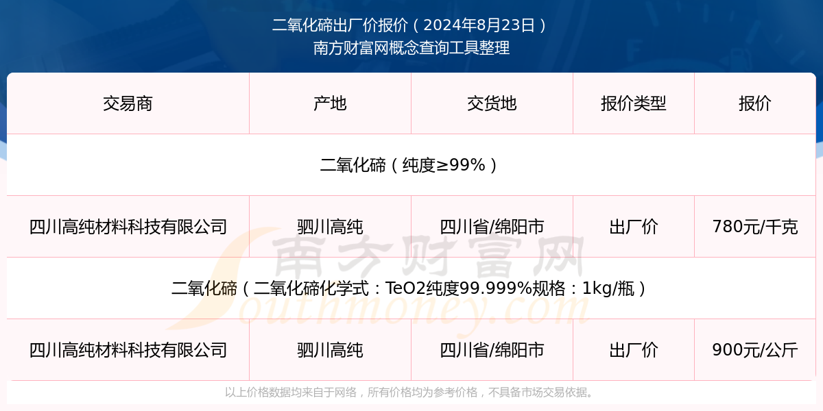 2024年8月23日,四川高純材料科技有限公司二氧化碲(純度≥99%),駟川高純,交易地點(diǎn)為四川省/綿陽市,出廠價(jià)報(bào)價(jià)為780.00元/千克。