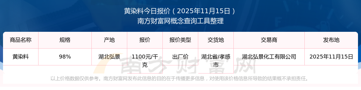 2025年11月15日,黃染料(98%)出廠價價格為1100.00元/千克,報價人:湖北弘景化工有限公司,交易地點為湖北省/孝感市。