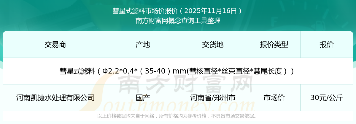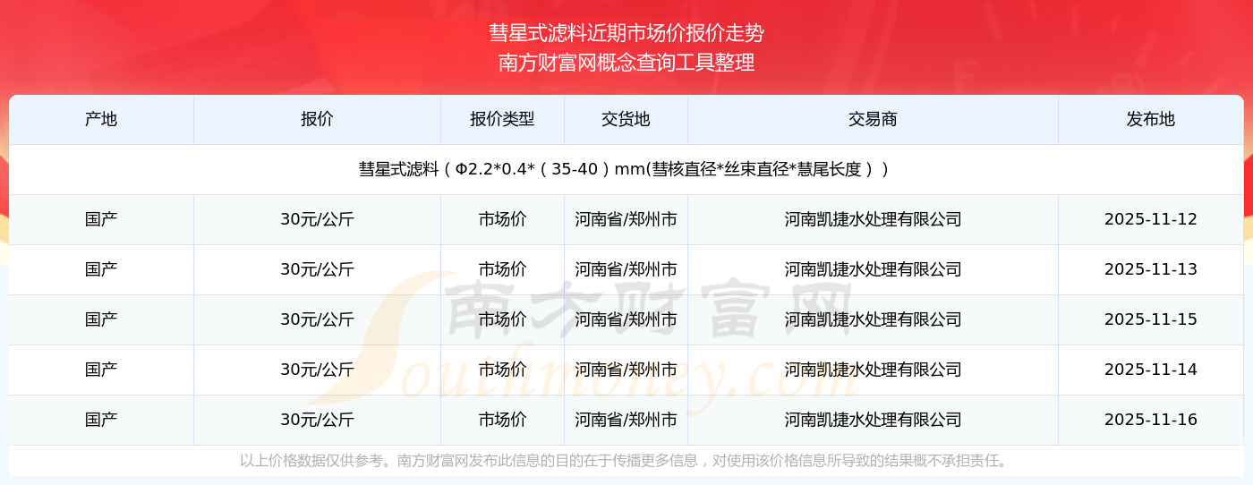 2025年11月16日彗星式濾料最新價格