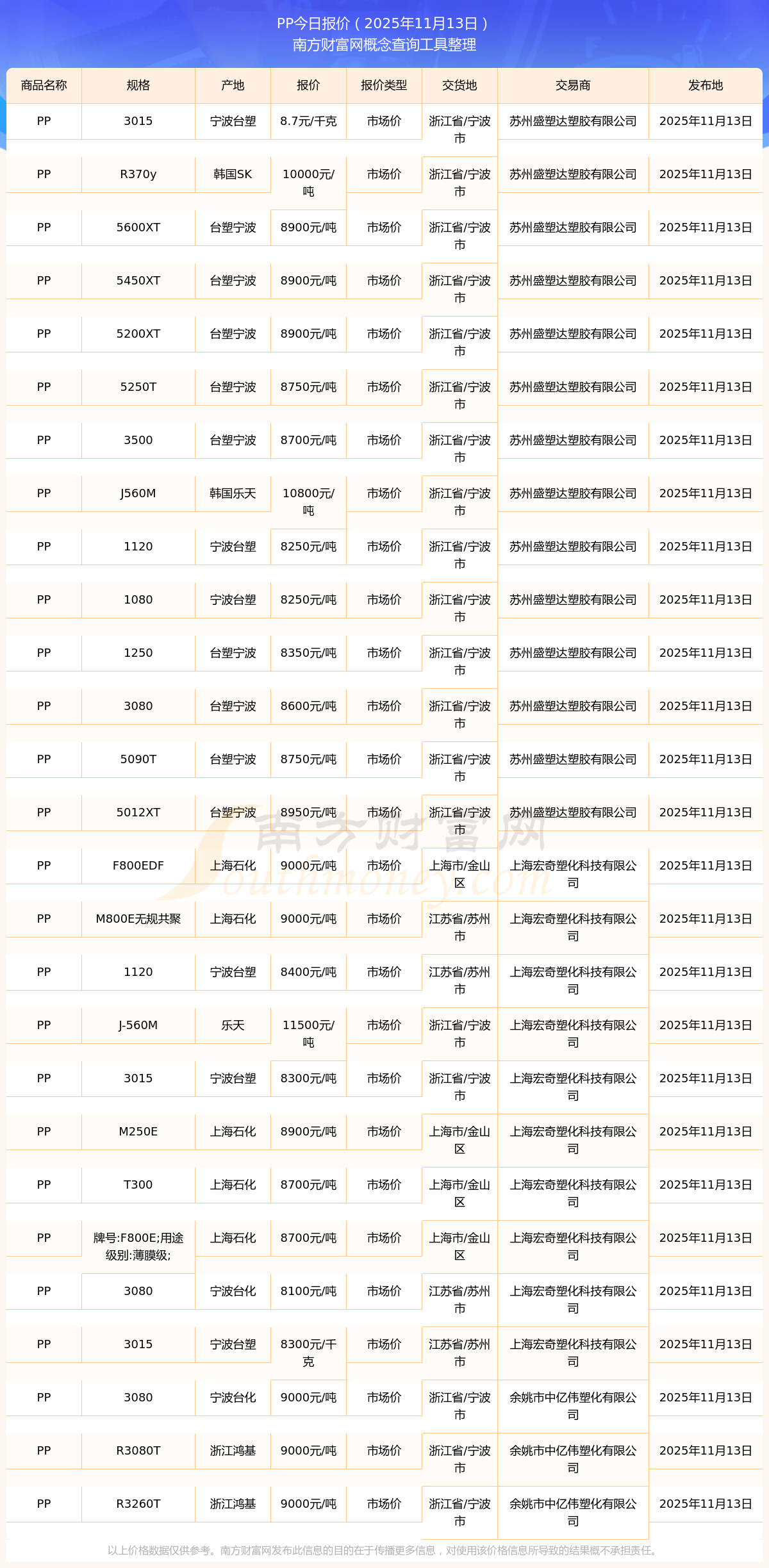 2025年11月13日,PP(R370y)市場價價格為10000.00元/噸,報價人:蘇州盛塑達(dá)塑膠有限公司,交易地點為浙江省/寧波市。