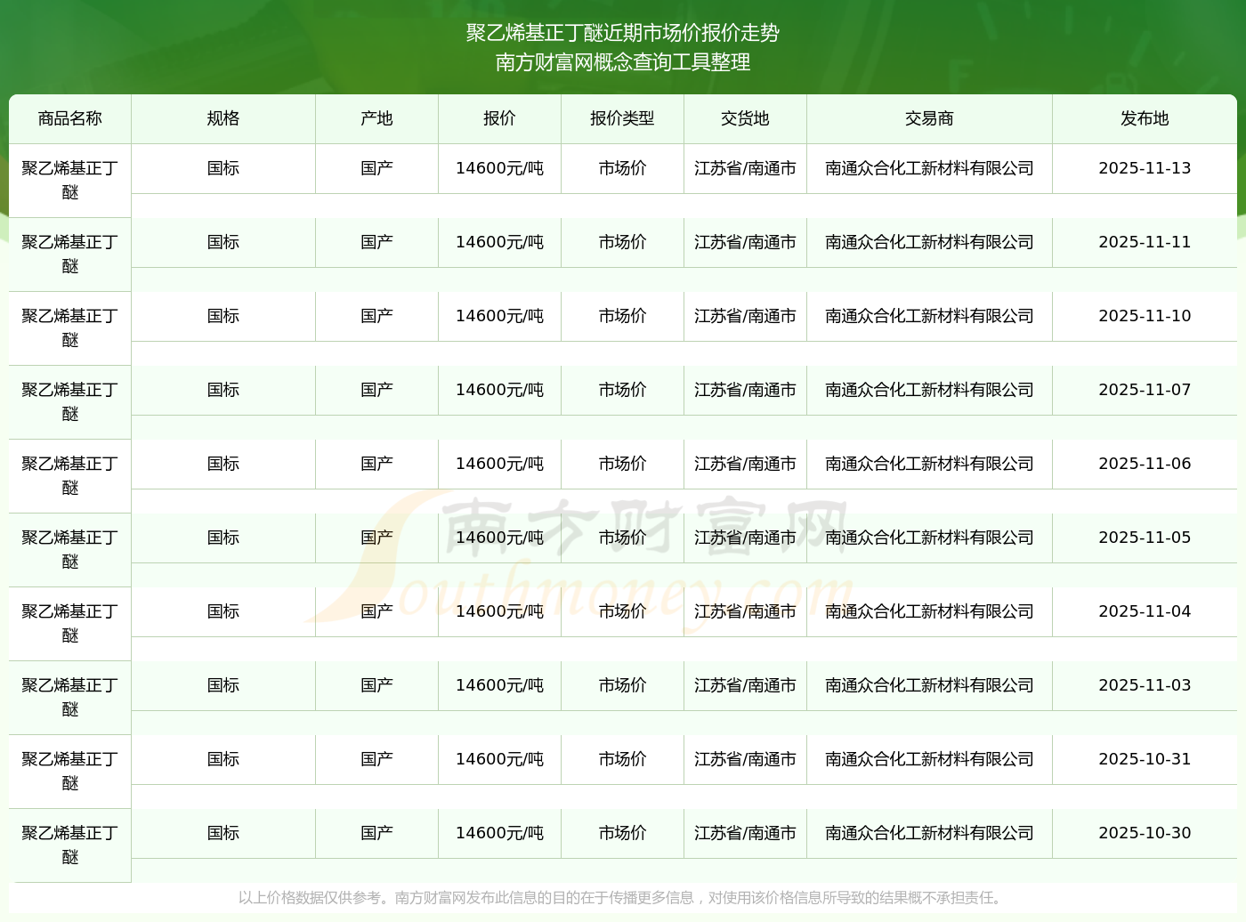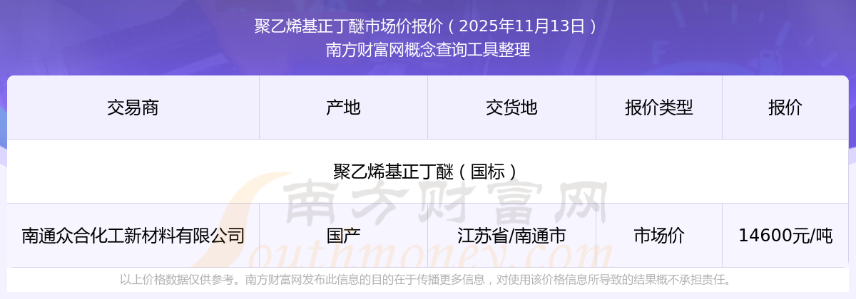 2025年11月13日,聚乙烯基正丁醚(國標(biāo))市場價(jià)價(jià)格為14600.00元/噸,報(bào)價(jià)人:南通眾合化工新材料有限公司,交易地點(diǎn)為江蘇省/南通市。