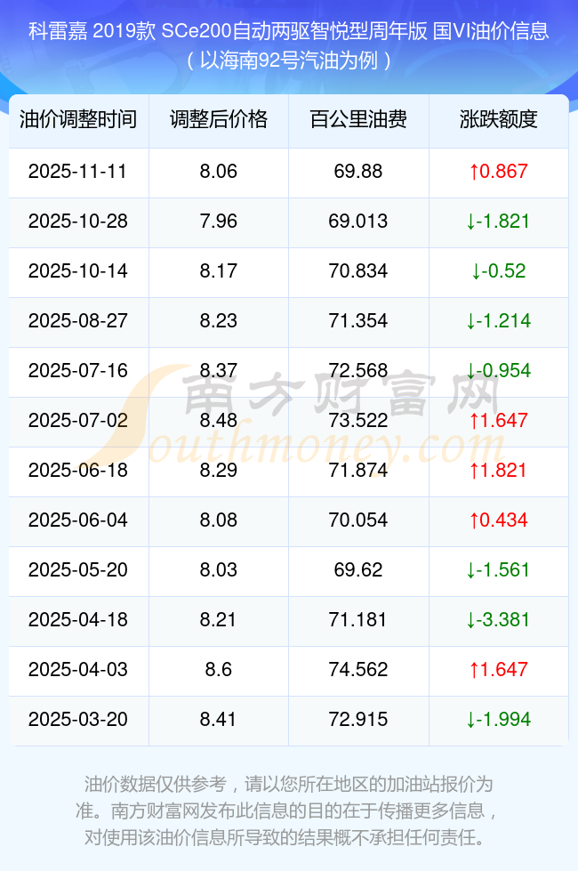 依照11月11日92號汽油最新調(diào)整價格8.06元/升來計算(以海南為例),該車型百公里的平均油費是69.88元,依照上一輪10月28日調(diào)整價格7.96元/升來計算,百公里的平均油費是69.013元,對比上一輪多花0.867元,下一輪的油價調(diào)整時間11月24日24時。